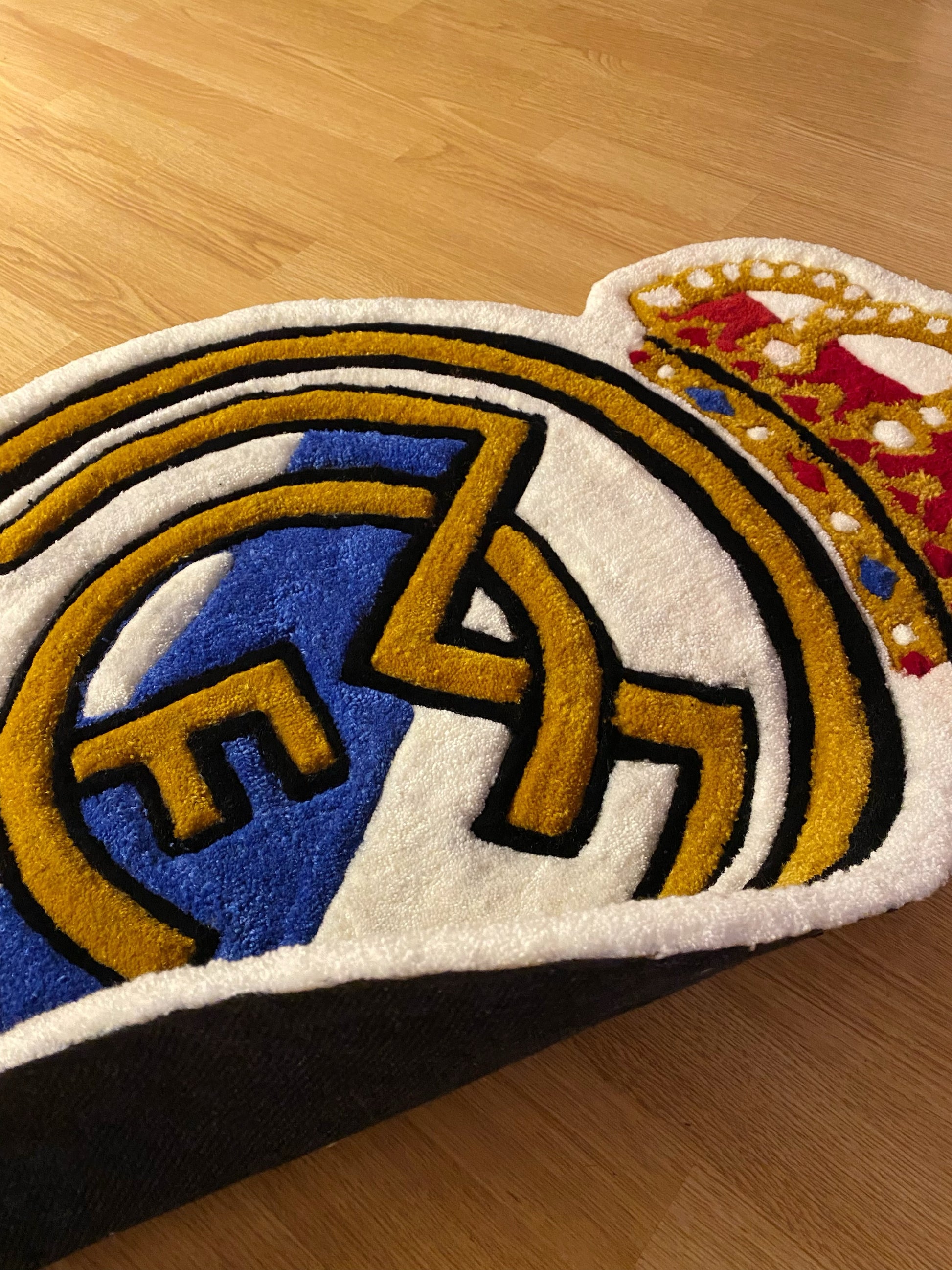 A handcrafted rug featuring a majestic crown emblem and interlocking initials, designed in classic white, gold, and navy tones. A perfect statement piece for fans of royal football heritage.